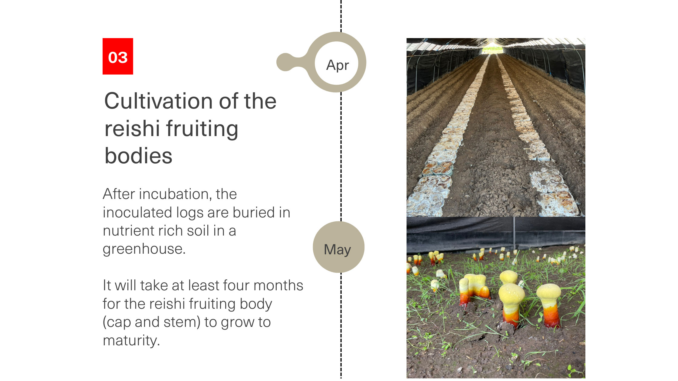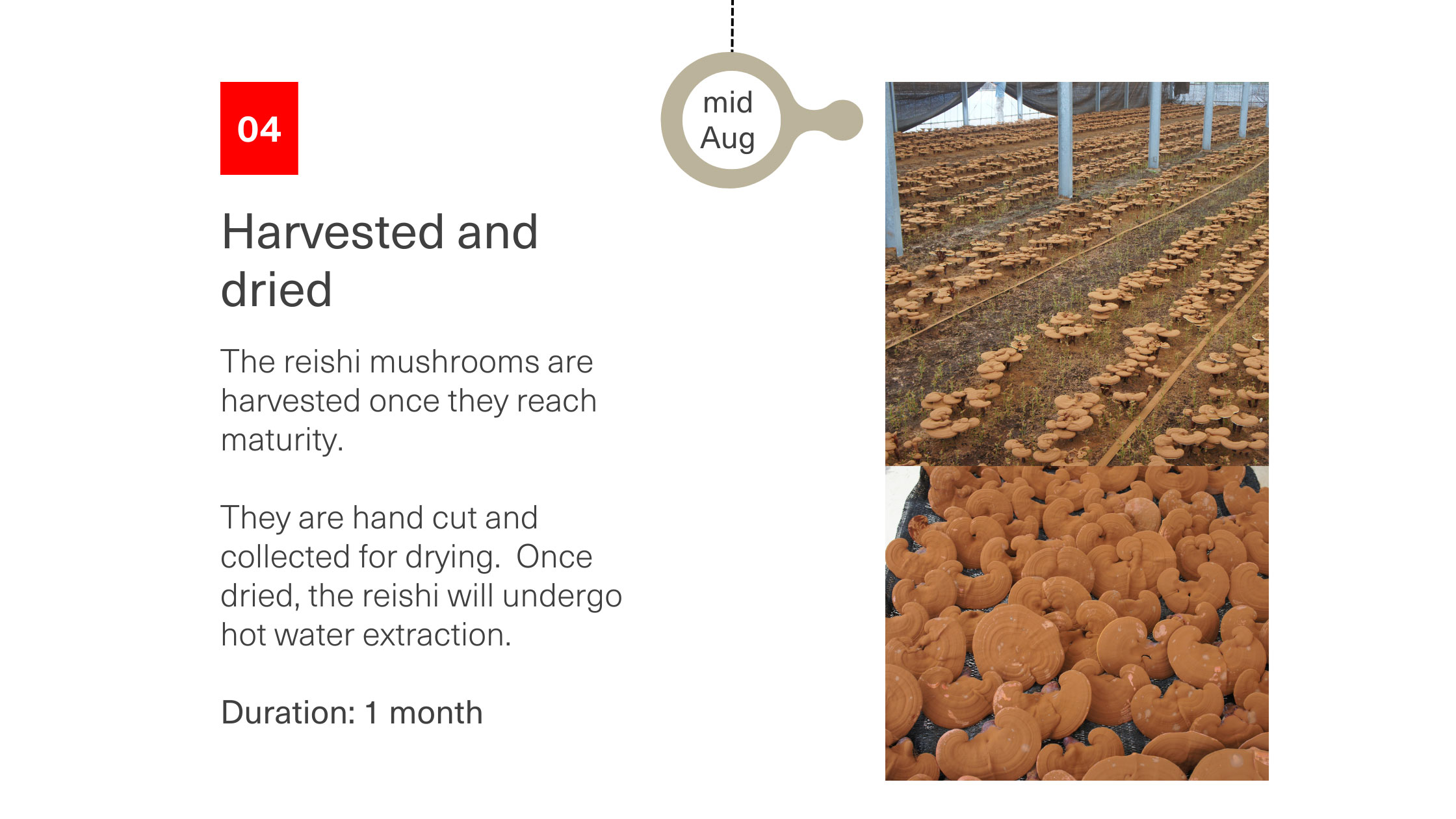 The Mayuzumi family pioneered the natural wood-log method in the 1970s, making it possible to consistently grow and harvest high-quality red reishi. From culturing the Mayuzumi red reishi strain to harvesting and drying, the entire process takes a full year. Although labour-intensive, this traditional method yields red reishi of unmatched potency and integrity—and is still used in every Mikei® red reishi product today.